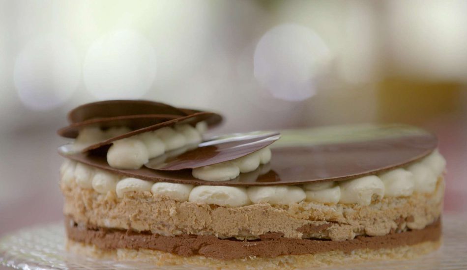 - Spuit op de derde plak dacquoise toefjes witte chocoladecrème.