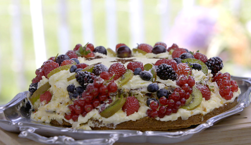 - Strijk de boven- en zijkant van de taart af met het overige deel van de mascarpone crème.