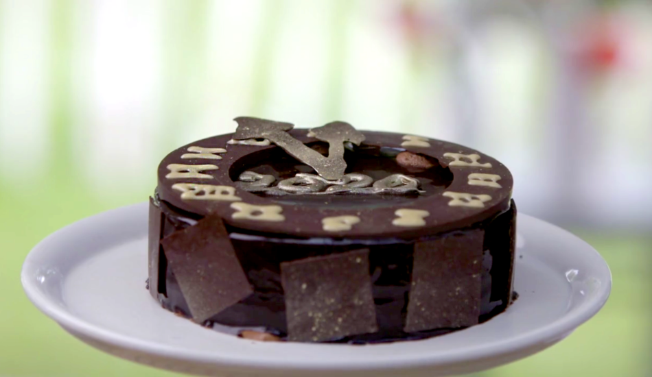 - Leg uiteindelijk de chocolade klok op de taart en serveren maar!