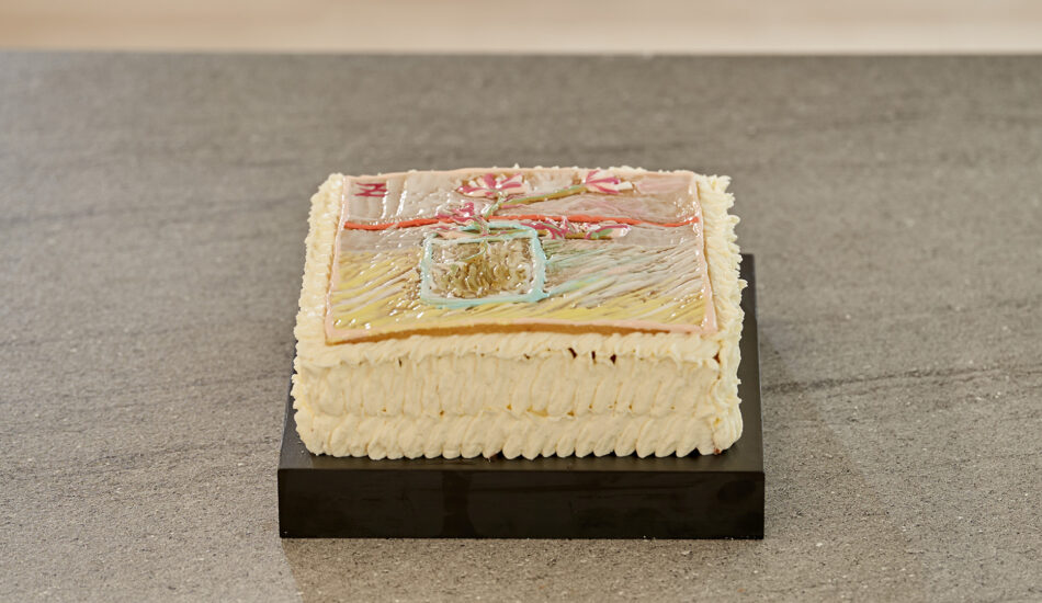 - Haal de plak marsepein uit de koeling, leg deze op de taart en beschilder met de royal icing.