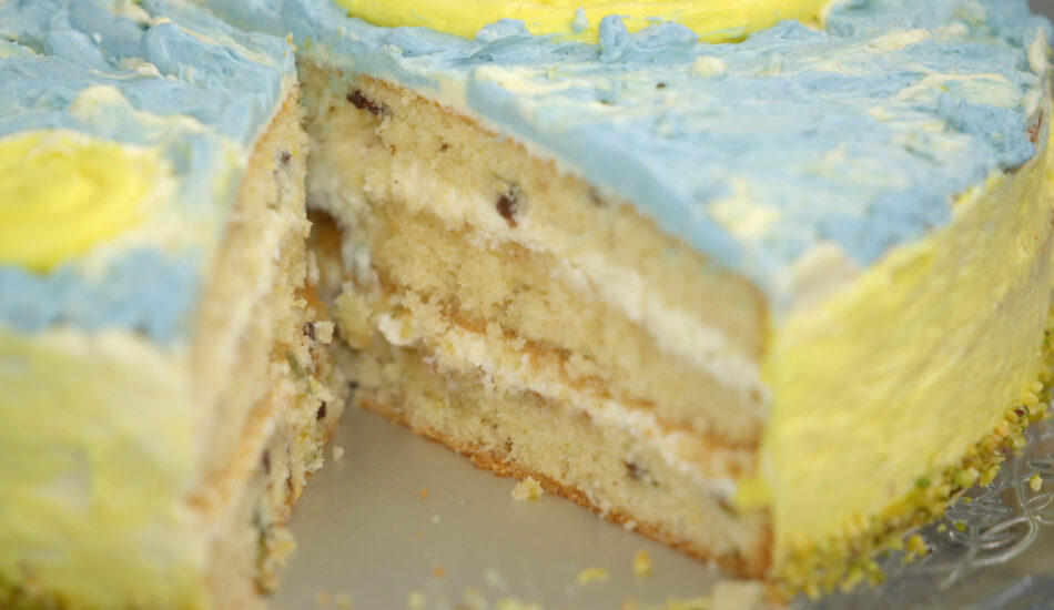 Een amandelcake met rozemarijn, pistache, chocolade en een vulling van mascarpone met de slagroom. De combinatie van amandelen met citrus maakt het tot een lekkere frisse taart.