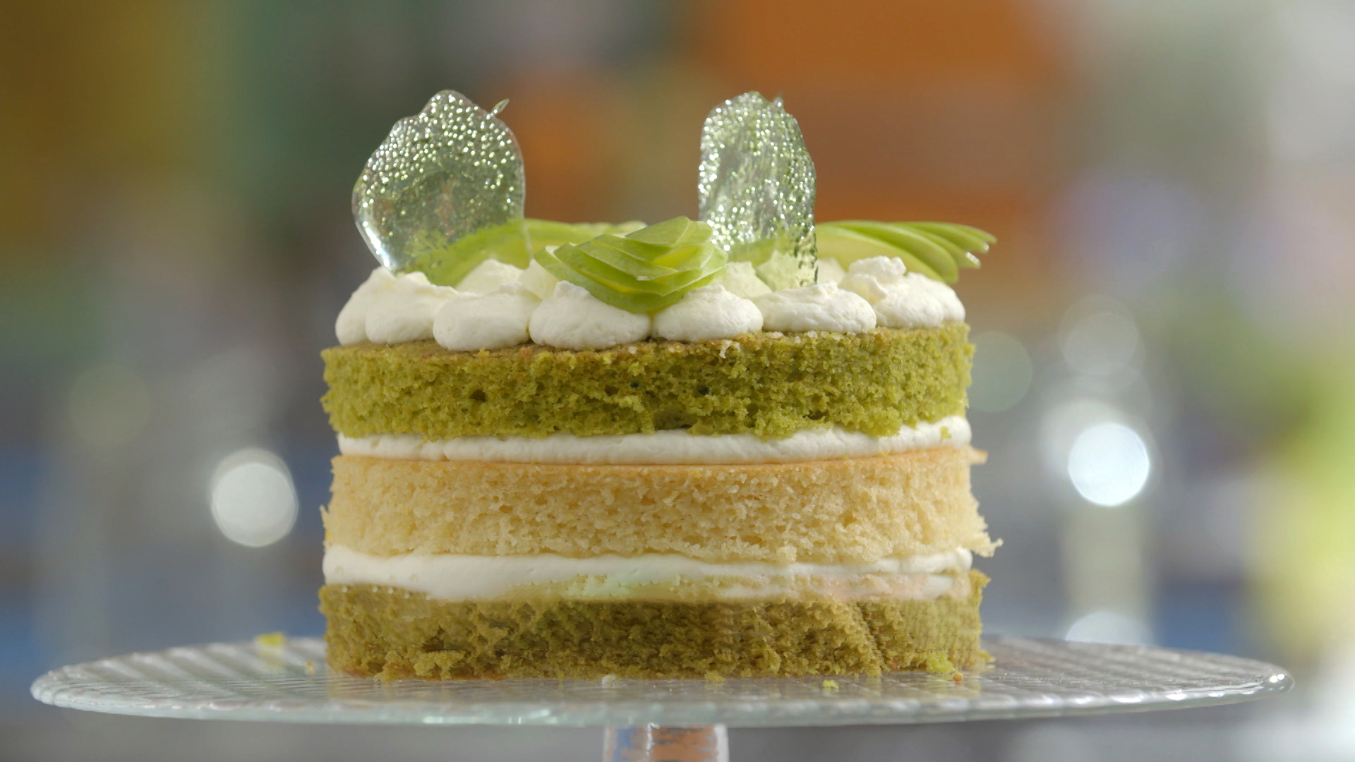 - Leg een plak groene cake op een verplaatsbare vlakke bodem.