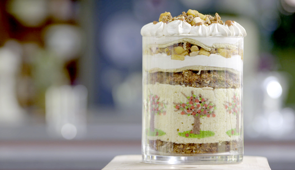 - Herhaal weer met kaneelroom, gebakken fruit en gebrande noten.