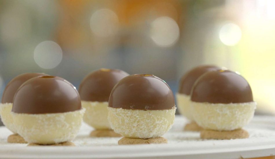 - Bestrijk de witte halve bol met iets witte chocolade en haal hem door de geraspte kokos. Laat het onderste deel van de halve bol vrij voor een goede hechting.