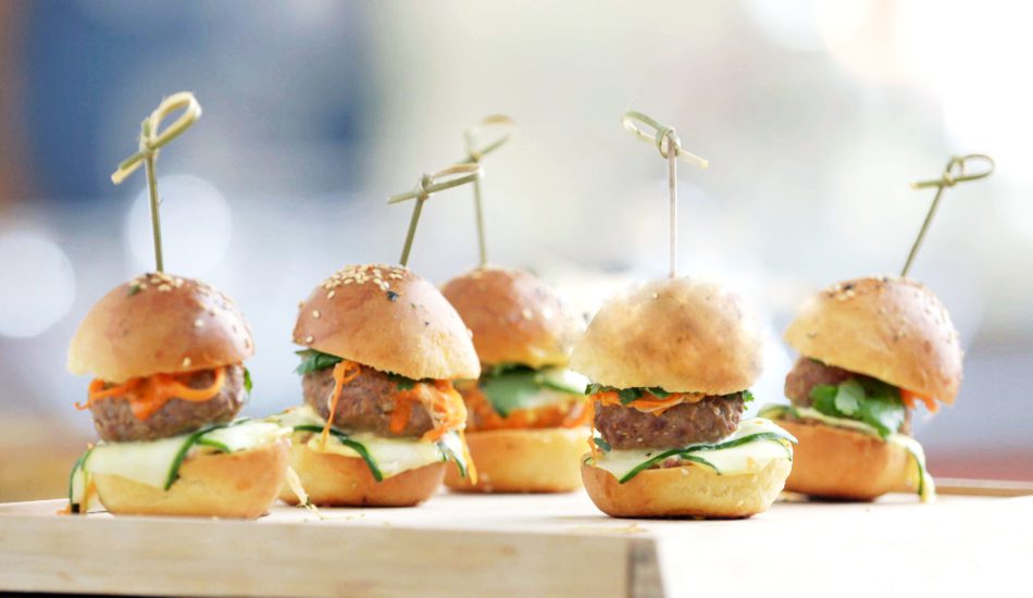 - Maak elk broodje in deze volgorde op (van onder naar boven): pâté, kewpie mayonaise, komkommer, burger, zoetzure groente, koriander, kewpie met sriracha.