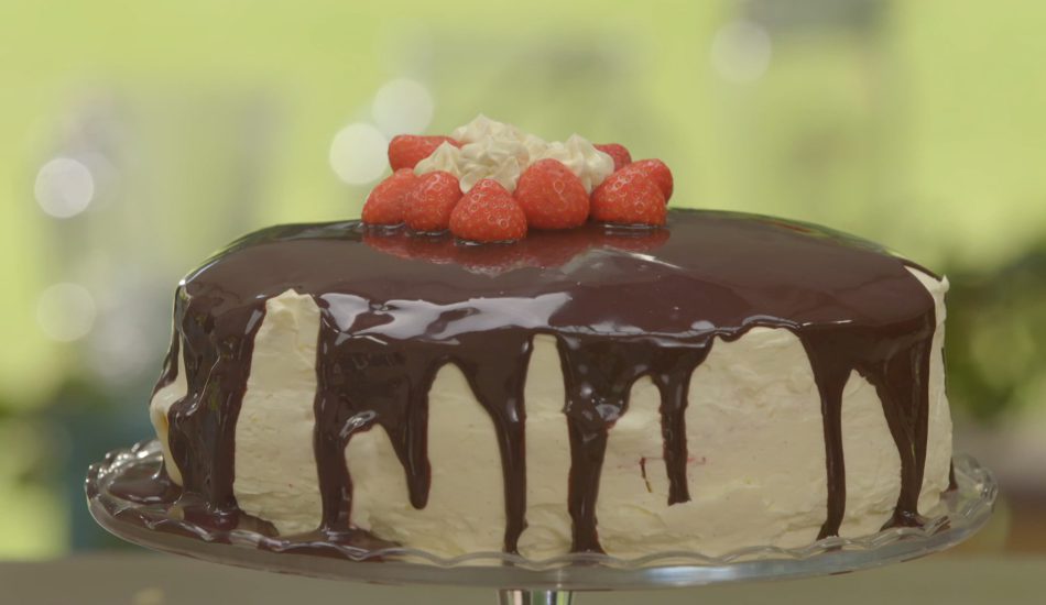 - Dek af met een biscuitlaag en tempreer deze met aardbeiensuikersiroop.