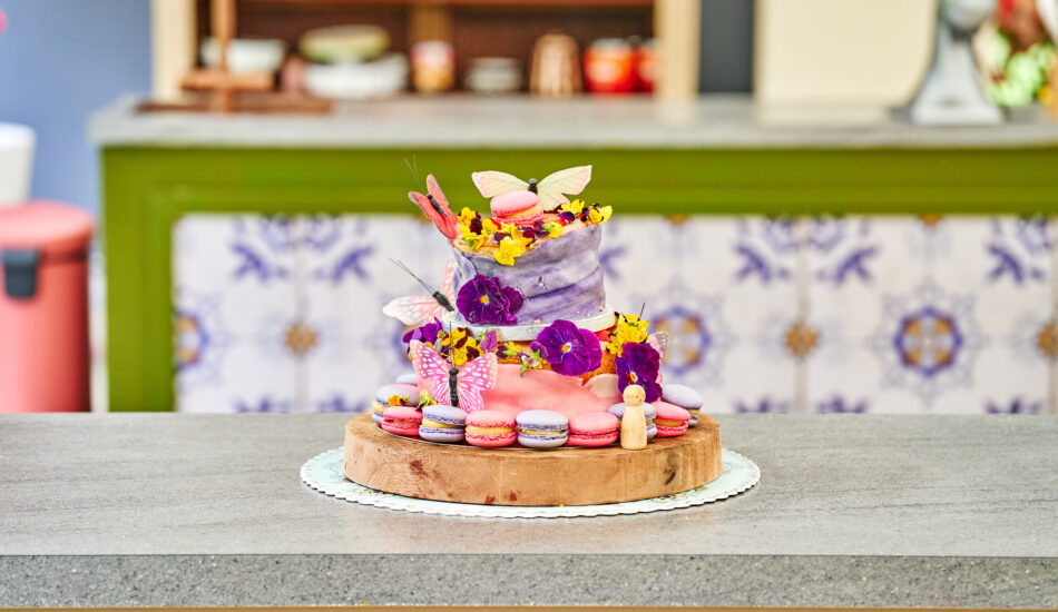 - Decoreer de rest van de macarontaart met vlinders en eetbare bloemen.