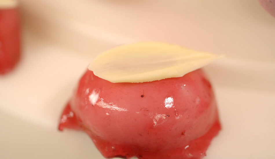 • Voorzie de krokantjes van een laagje ganache en plaats de bolgebakjes erop.