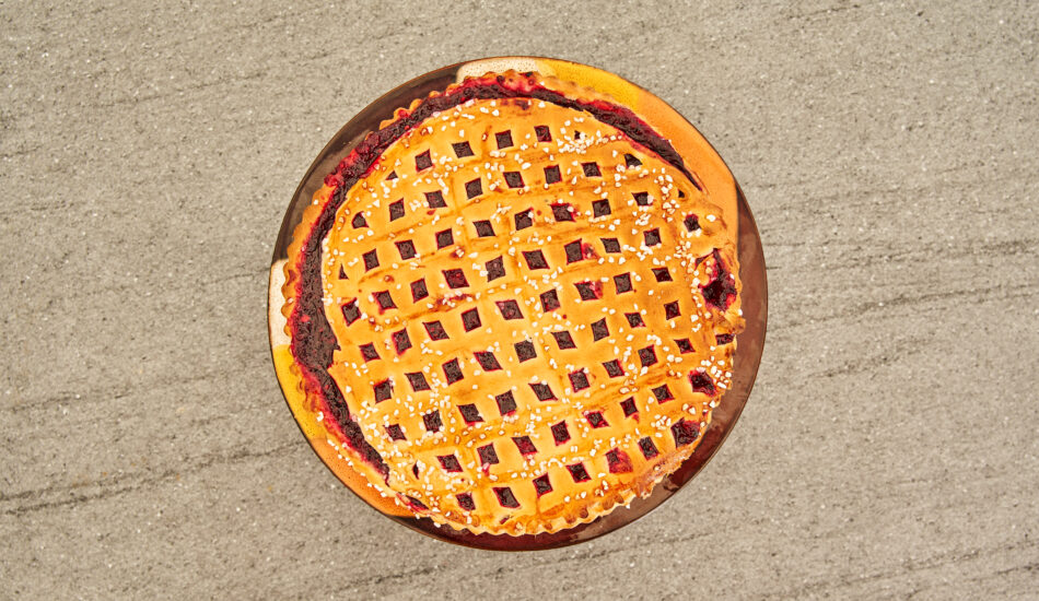 • Rol van het overgebleven deeg stroken en maak hiermee een rooster op de bovenkant van de vlaai.