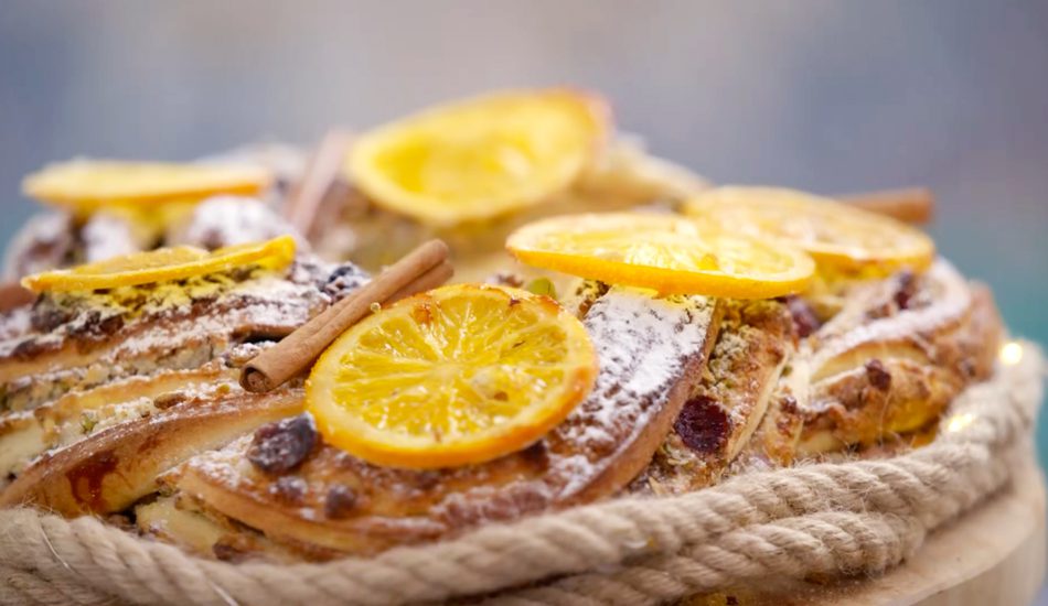 - Verdeel ook de pistachenootjes over het deeg en rol het aan de lange kant op.