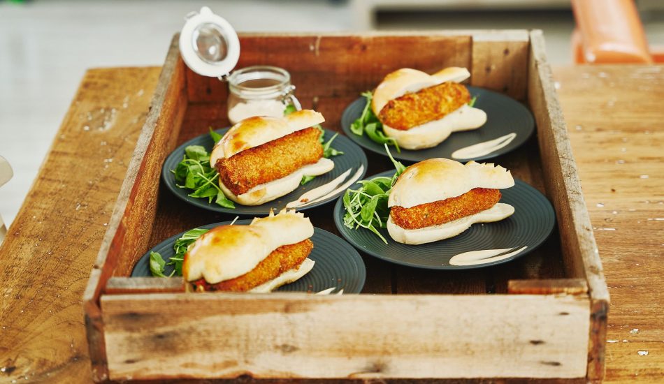 - Snijd het visbroodje langs de buik open en beleg met een beetje rucola en de kroket.