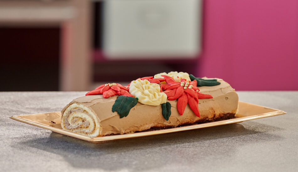 - Zet eenderde van de crème apart voor het maken van de bloemetjes die op de bûche komen.