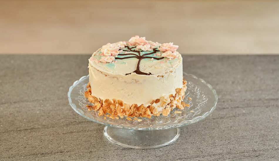 Een plaatje, deze taart. Met al die verschillende pasteltinten. Een lentetaart, die ook best in januari kan volgens de jury. Heerlijk met perzik en vlierbloesem.