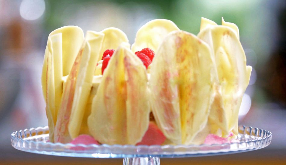 - Bouw de taart doormiddel van 1 laag biscuit, 1 laag champagnemousse, 1 laag biscuit, 1 laag frambozenmousse, 1 laag biscuit, 1 laag champagnemousse, 1 laag frambozenmousse en tot slot 1 laag biscuit.