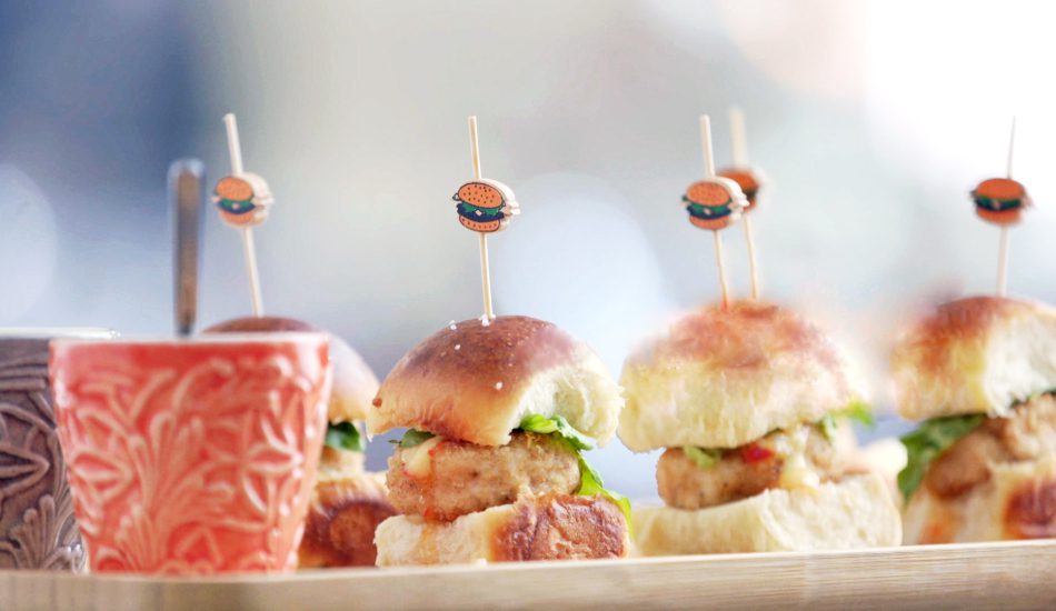 - Volg met de kipburgers, chilisaus en eindig met het kapje van de bolletjes.