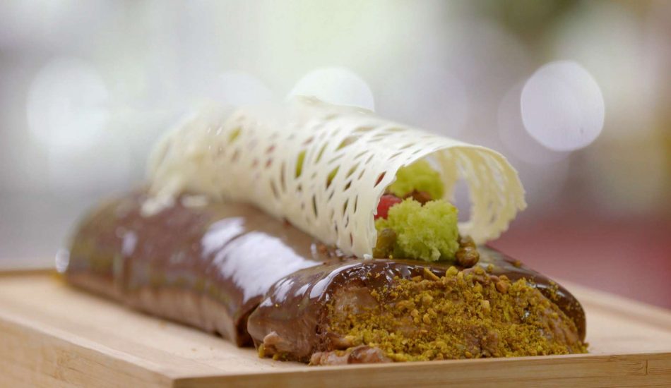 - Leg in het midden bovenop de taart een rij verse frambozen met de open kant naar beneden. Breng ertussen hier en daar stukken wat sponge cake, cacaocrumble en gekarameliseerde pistachenoten aan.