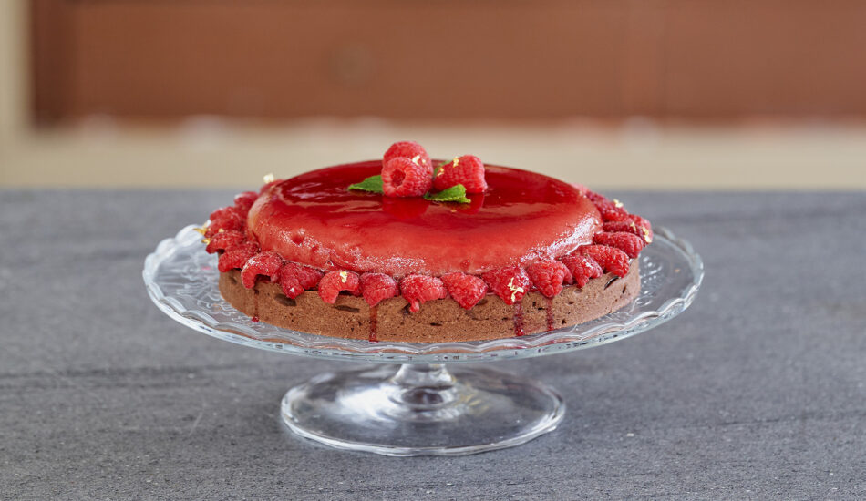 - Leg nog een paar frambozen bovenop de chocoladetaart en versier met munt en bladgoud.