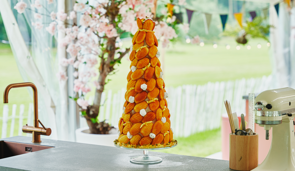 - Prik de madeleines met de brede schelpvorm naar boven dakpansgewijs van onder naar boven aan op de kegel met cocktailprikkers.