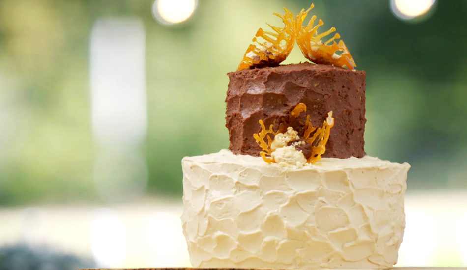 - Zet het kleine taartje op de grote en decoreer de taart met de karameldecoratie.