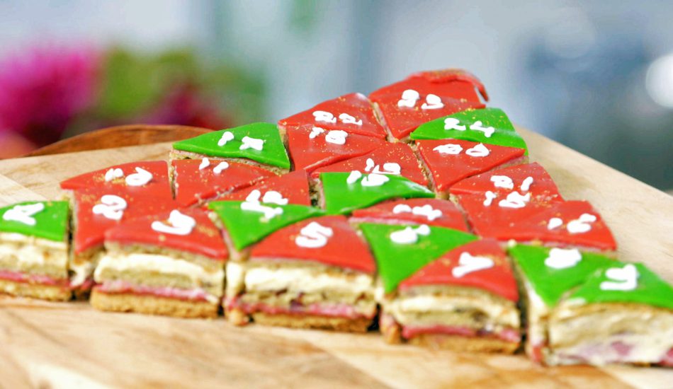 - Snijd 16 gelijke rode en 9 groene driehoeken uit de plakken marsepein.