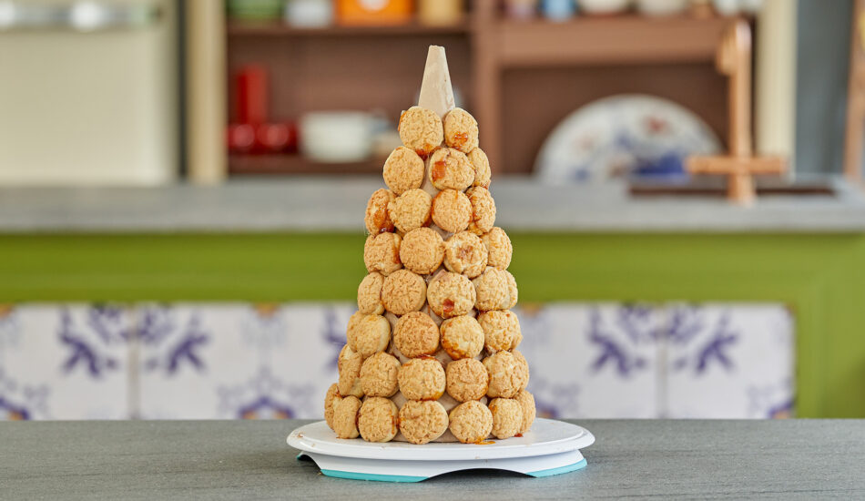De soesjes op deze croquembouche zijn gevuld met hazelnoot-amandelpraliné en een hazelnootvulling. Je raadt het al: het is echt een taart voor hazelnootliefhebbers.