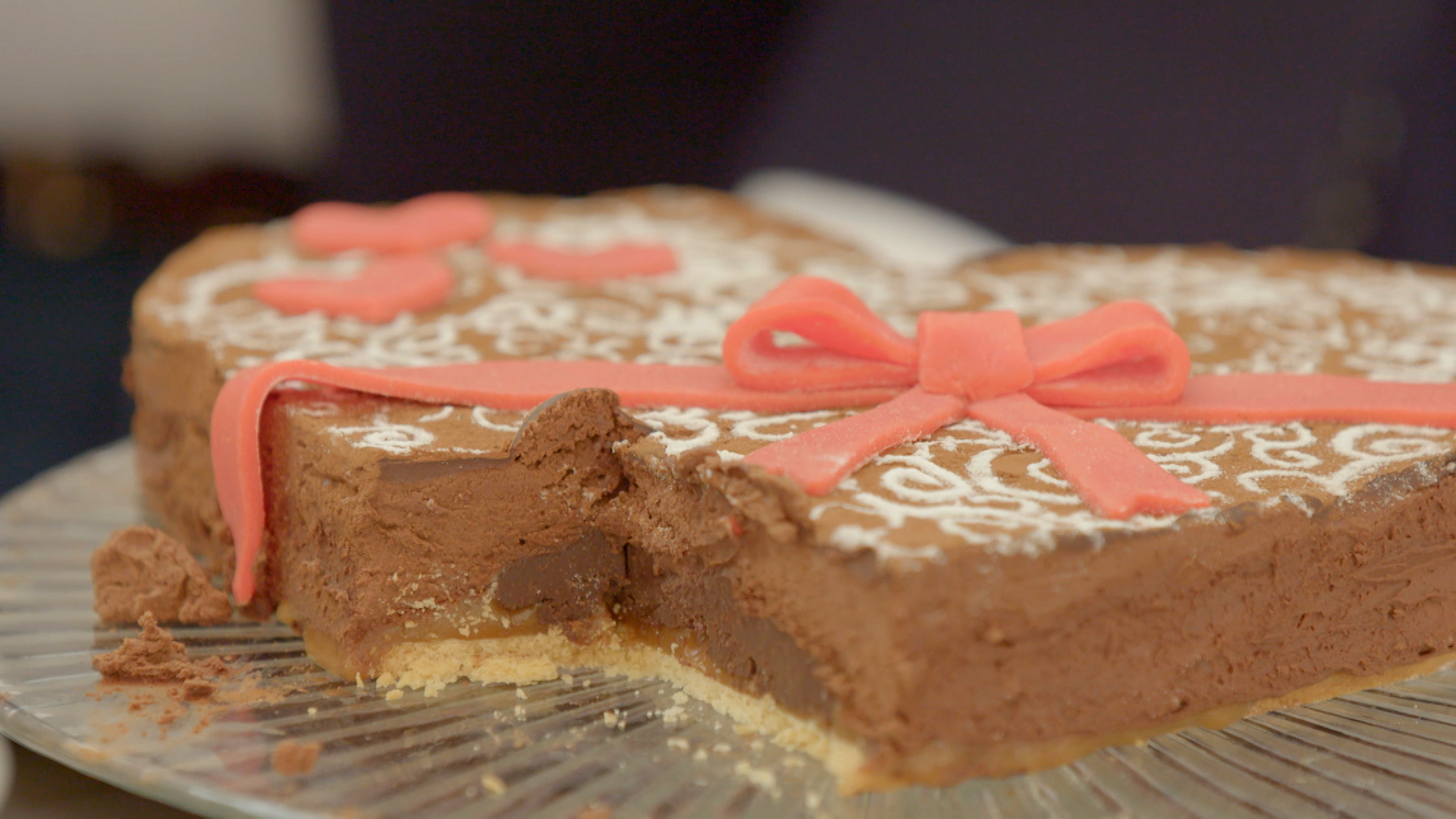 - Verwarm de room met de chocolade en kaneel op een matig vuur. Blijf roeren tot een homogeen mengsel is ontstaan. Laat iets afkoelen. Verdeel dit voorzichtig over de hartvorm en strijk glad voor een gelijkmatige, strakke laag.