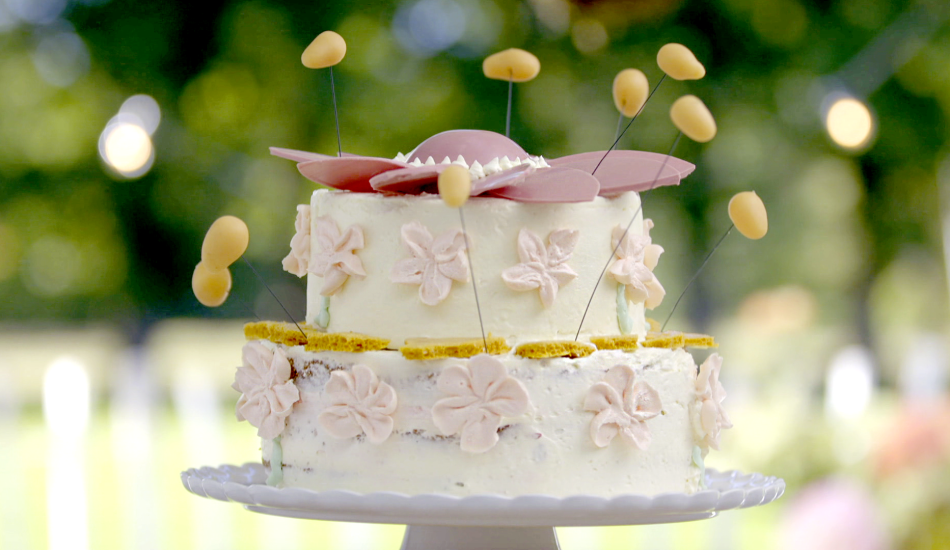 Een honing-tijmcake met een rozenwaterbiscuit, bramenconfituur, honeycomb, vliegbloesemcrème, marsepeinen bijtjes en een bloem van roze ruby chocolade. Deze taart doet zijn naam eer aan!