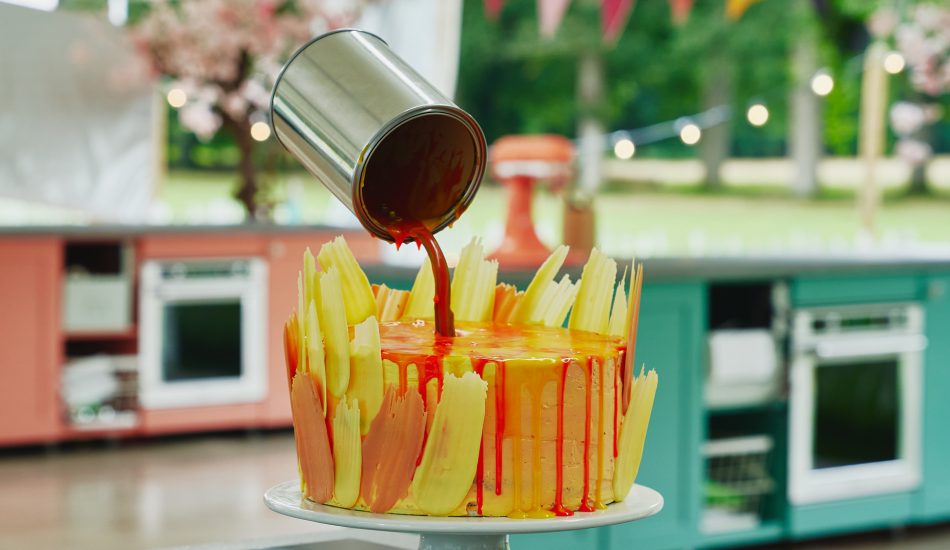 - Steek het blik in de taart en schenk de rest van de ganache over de taart.