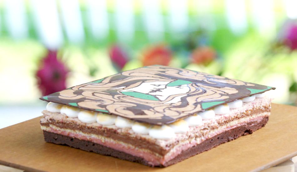 - Haal de taart uit de koelkast en verwijder de ring en de acetaatfolie. Brand het kookschuim af.