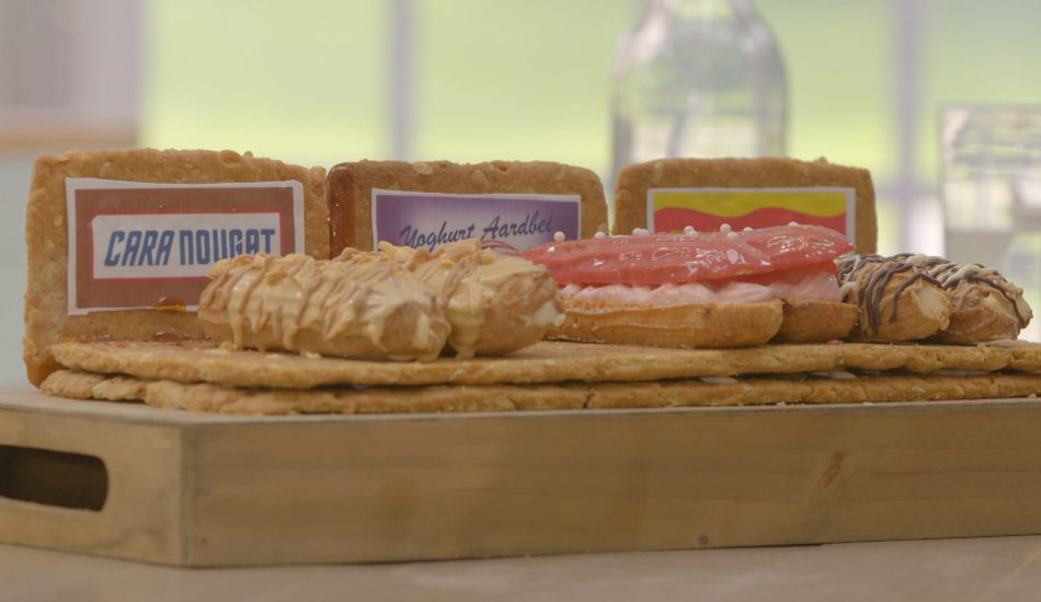 - Spuit mousse in de eclairs en leg de deksel er op.