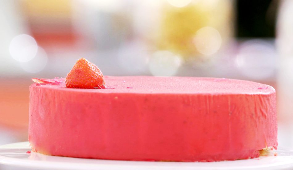 - Plaats de aardbeien gedoopt in gelei op de taart en garneer met gesponnen suiker.