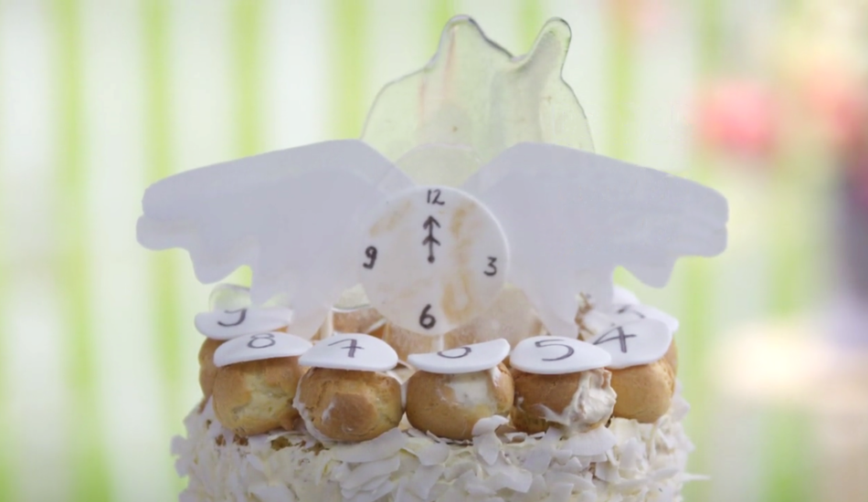- Plaats het isomalt figuur op de taart tussen de soesjes.