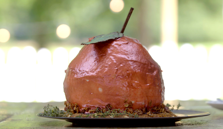 - Zet de pruim op de grote granola koek en maak het af met het chocolade blad en de stengel.