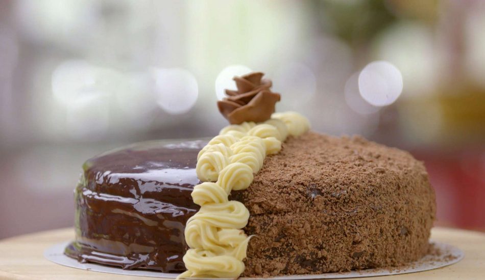 - Breng 3 roosjes van chocolade aan op de taart.