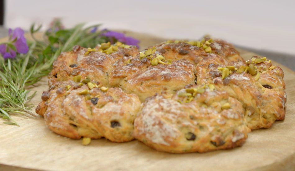 - Giet de overige olijfolie in een schaaltje, voeg de rozemarijn toe met de rietsuiker, de kardemom, de anijszaadjes en de pistache.