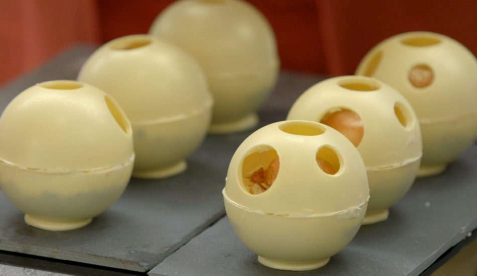 - Breng de chocolade voor de bollen op temperatuur en vul de vormen gelijkmatig.