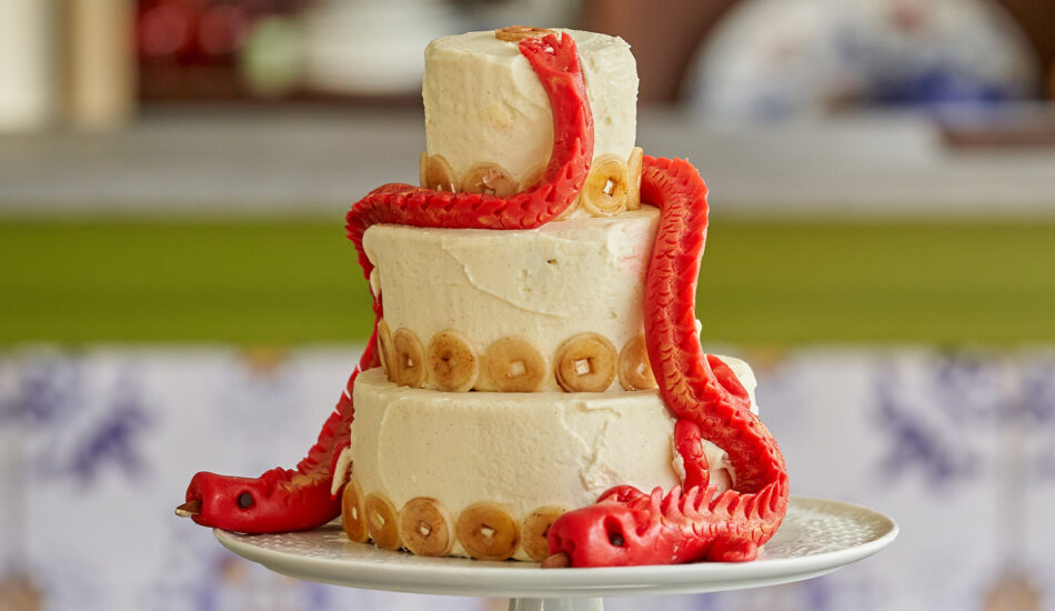 De Chinese twist in deze drakentaart zit vooral in de specerijen. De subtiele hint van de pitayapoeder en five spices zorgen voor een verrassende smaak.