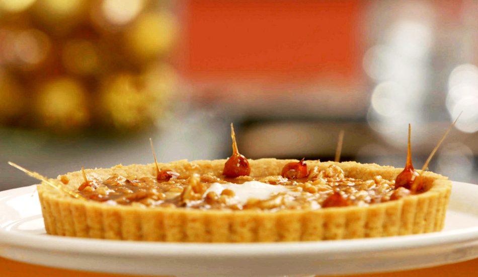 • Schenk vervolgens het kokoscrème-mengsel bij de gekaramelliseerde suiker en voeg walnoten toe. Roer goed en verdeel over de taartbodem.