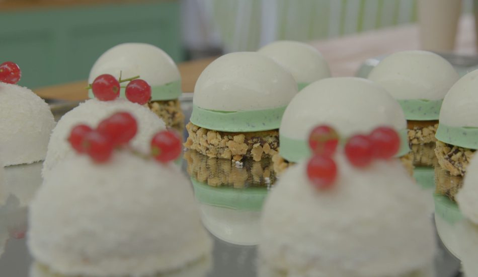 - Zodra het koud is, snijd 12 rondjes met een diameter van 7 centimeter uit het biscuit. Gebruik 6 biscuitcirkels voor de Tropische-Colada domes en 6 voor de Pitahaya en limoen domes.