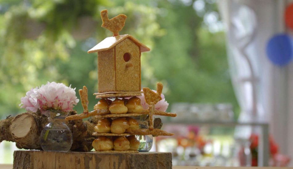 - Zet 4 à 5 soesjes, afhankelijk van de grootte, als het er maar iedere etage evenveel zijn, op een rondje nougatine. Maak zo drie etages.