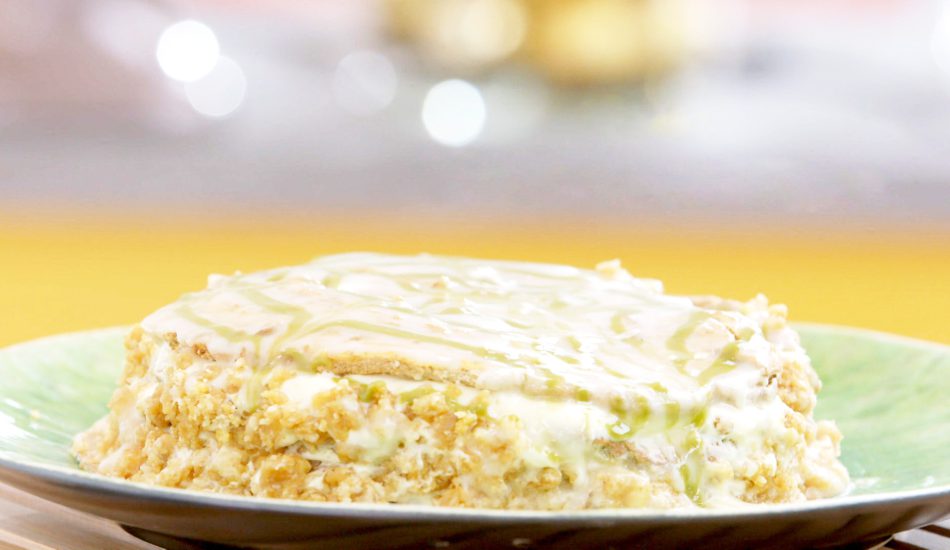 - Bedek de zijkant van de taart met praline en garneer de bovenkant van de taart met de gekonfijte limoen.
