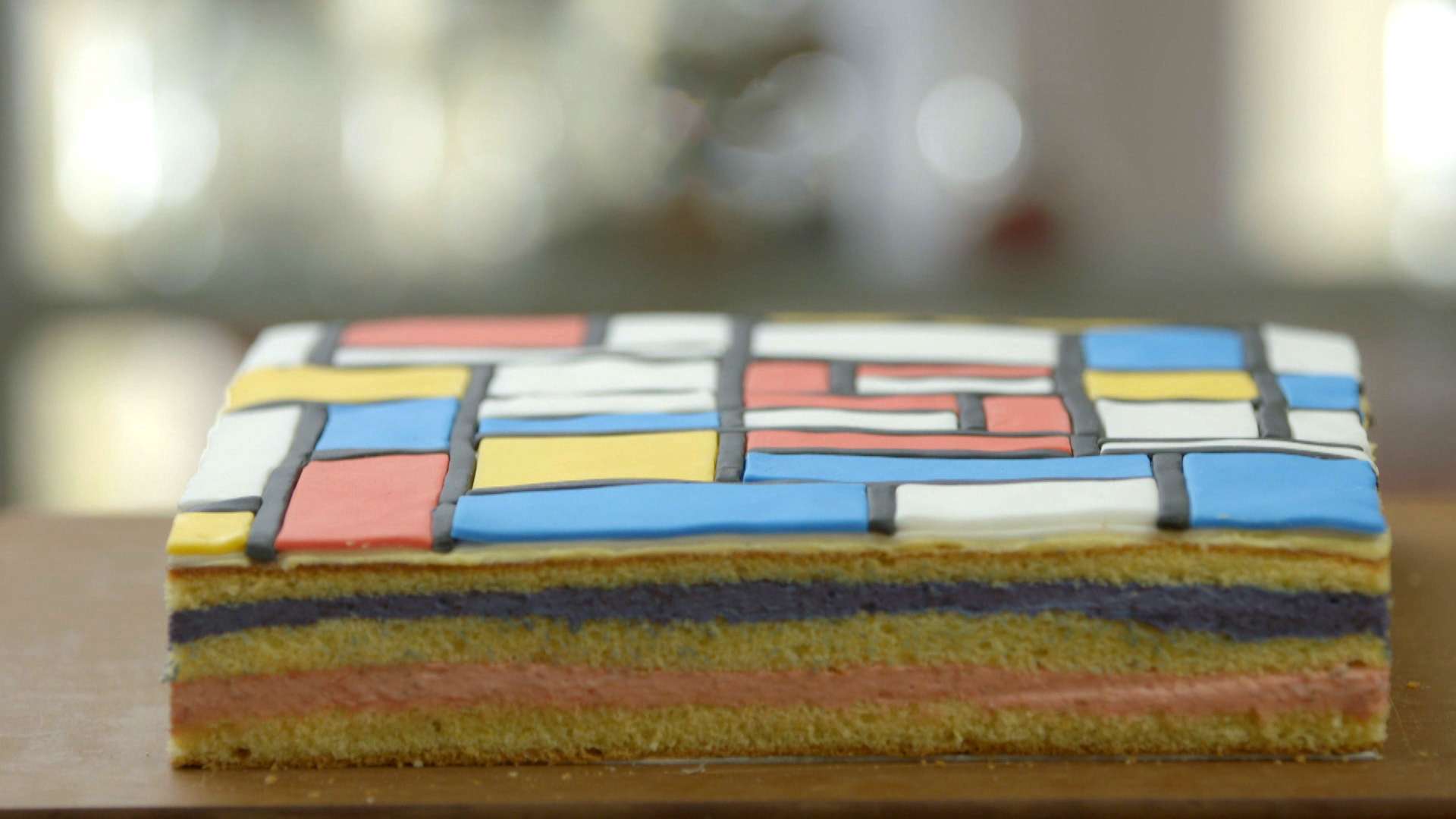 - Maak de taart op met Mondriaan-kleuren en patronen.