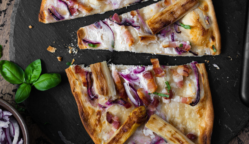 - Beleg de bodems met crème fraîche, witte asperges, rode ui, spekjes en kaas (zoveel als je zelf lekker vindt). Je kunt het natuurlijk ook nog aanvullen met andere toppings.