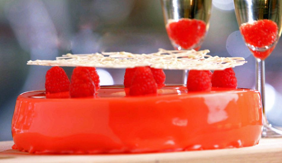 - Schep de champagnemousse in de taartring, volg met de fruitlaag, de overige champagnemousse en een laag Moskovisch biscuit.
