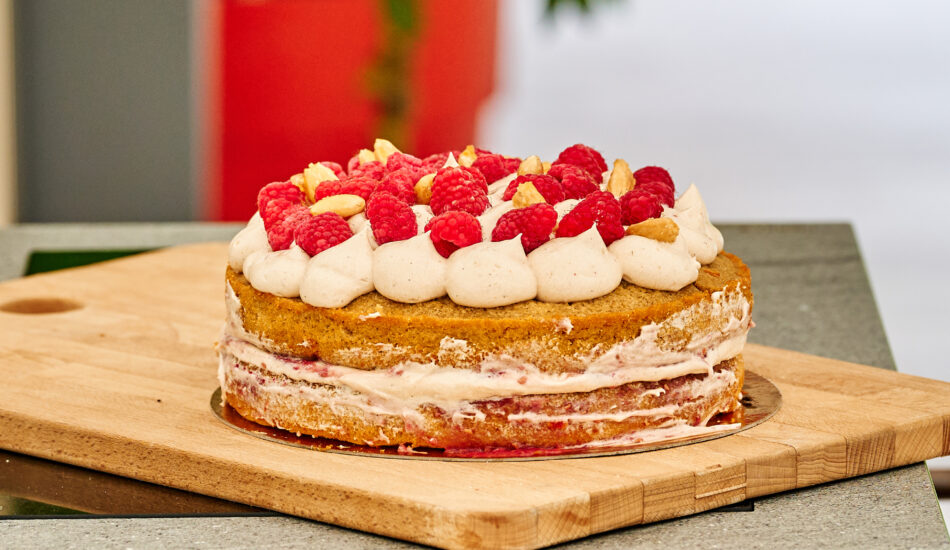 - Decoreer de bovenkant van de cake met verse frambozen en de hele gekarameliseerde amandelen.