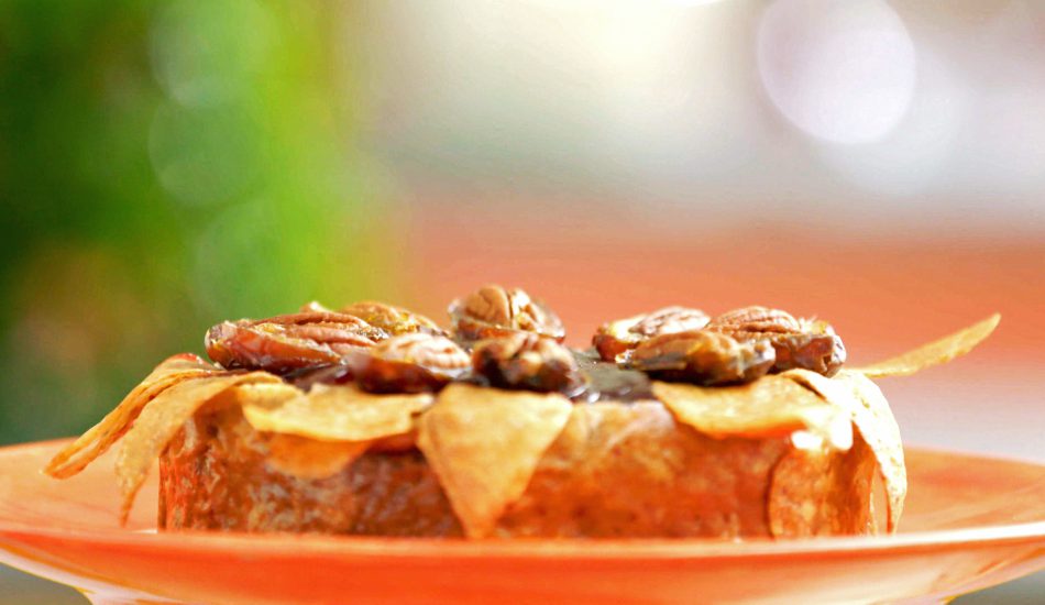 - Garneer de taart met de kletskoppen, 6 pecannoten en 6 dadels.
