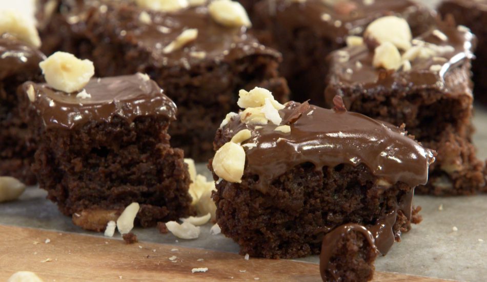 - Smeer de ganache over de brownies en garneer met de hazelnoten.