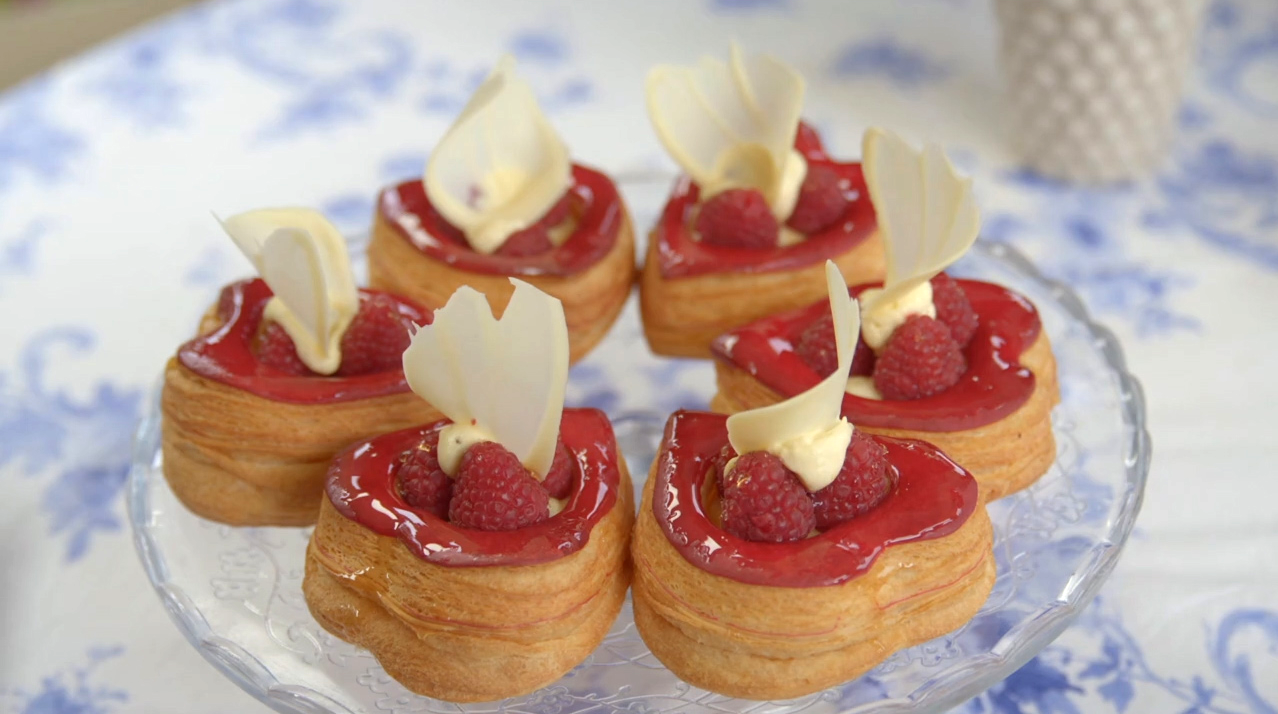 - Vul de harten met Zwitserse room en verdeel er wat frambozen over.