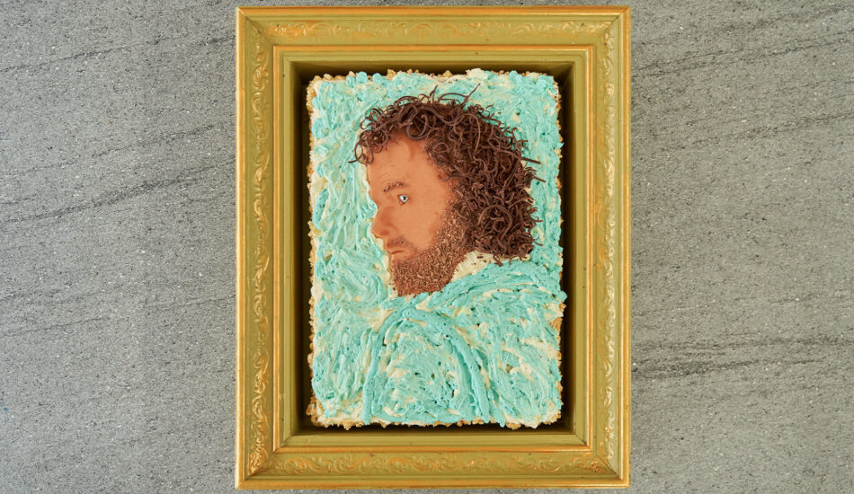 - Verdeel wat hoopjes botercrème over de taart waar geen portret op komt en meng met een paletmesje de kleuren grof door elkaar.