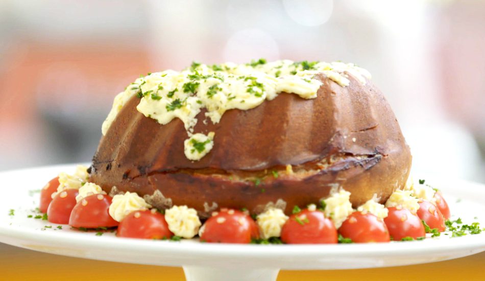 - Garneer de tulband met kaascrème, cherrytomaten en peterselie.